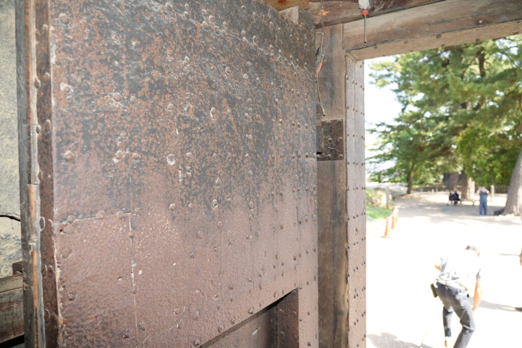 天守へは附櫓から入ります。上には狭間や石落としがあり、扉も鉄でできています。