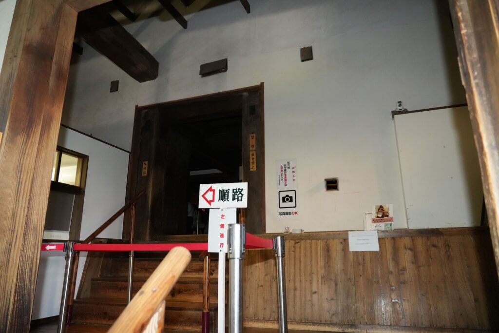 受付があるところまでが附櫓です。天守入口を見ると、ここにも小さな狭間があります。