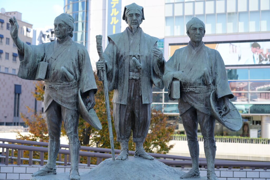 水戸といえば水戸黄門。駅前では銅像がお出迎えです。ここからバスで歴史館に向かいます。